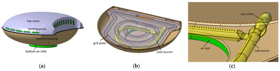 The grill structure includes a top cover, bottom housing, grill plate, tube burner, and fuel orifice, as shown in Figure 3. The top cover has venting pores to provide combustion heat, and the exhaust gas can flow out of the oven cavity when the cover is in use. The bottom housing includes an oil collecting pan and a base cover to form a gap to provide the air required for combustion (in the bottom air inlet).