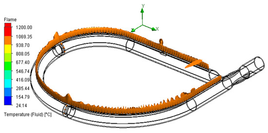 The combustion system with the modified design is simulated. The results shown in Figure 9 and Figure 10 indicate that the instability of the flame combustion conditions is reduced. When the stone grill plate is installed on the grill (Figure 7a and Figure 11a), the surface temperature distribution on the grill pan indicates that the flame-burning conditions are stable. The high-temperature area is not concentrated at the fuel nozzle outlet. The maximum temperature on the surface of the grill plate decreases from 293–320 °C (red zone) to 266–293 °C (orange zone), corresponding to a difference of 20–30 °C.