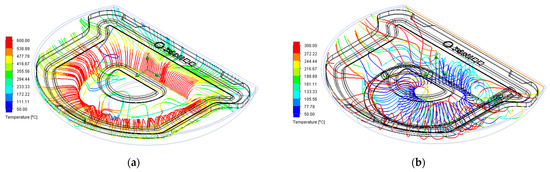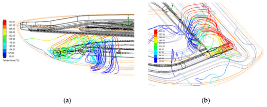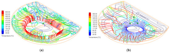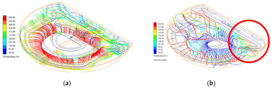 CA#1 combustion system analysis. (a) Burner streamline distribution (temperature); (b) Air inlet streamline distribution (temperature).