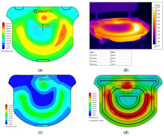 Figure 7 shows the surface temperature of the original grill plate and image recorded by the thermal imager. In Figure 7a, the orange-red part corresponds to a temperature of 266–320 °C, and the highest temperature observed in Figure 7b is approximately 300 °C. The high-temperature regions in Figure 7a,b are similar, and highlight that the area with the highest temperatures pertains to the fuel orifice. Figure 7c shows that the thermal stress on the surface of the grill pan is concentrated on the combustion pipeline. The maximum and minimum thermal stresses are 160 and 110 MPa, respectively, corresponding to a difference of 50 MPa.