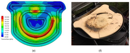 Original stone grill plate. (a) Temperature distribution on the surface. (b) Thermal image showing the temperature distribution on the surface. Thermal stress distributions on the (c) top and (d) bottom surfaces of the plate. (e) Thermal stress distribution at the bottom of the plate. (f) Observed cracking mode.