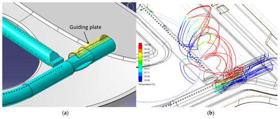 Improved design #1. (a) A guiding plate is installed in the original combustion tube; (b) Simulated gas analysis diagram of the improved design.