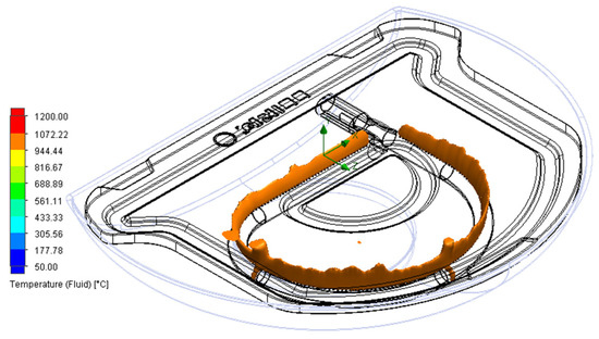Because the test stone grill plate typically fractures when the grill is opened for grilling, it can be assumed that when the top cover is opened, the convection of the cold air above the surface of the grill plate is intensified, resulting in a rapid temperature decrease over the pan surface. In contrast, continuous heating occurs due to the flame of the bottom combustion tube. These phenomena generate a significant temperature difference and thermal stress. At the point of opening the grill, the thermal images recorded by the thermal imager are consistent with those of the analysis model. Therefore, the image corresponding to the point at which the lid is opened is examined to analyze the stress distribution of the grill plate.