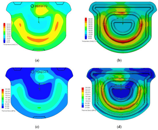 When the modified combustion tube is used, the temperature at the bottom of the stone grill plate is high, and all high-temperature regions are above the combustion tube, corresponding to the continuous rib at the bottom of the stone grill plate. At this location, the maximum temperature is 400 °C (red area). The low-temperature regions have temperatures of approximately 120–155 °C. The temperature difference is as high as 280 °C, as shown in Figure 11b. Moreover, areas with high thermal stresses on the surface of the stone grill plate correspond to the relative positions on the continuous ribs. The maximum thermal stress is approximately 108–155 MPa. The area with high thermal stresses at the bottom of the stone grill plate correspond to the continuous rib, as shown in Figure 11c. The maximum thermal stress is approximately 202–250 MPa, as shown in Figure 11d. Therefore, the thermal stress regions are positively correlated with the high-temperature regions.