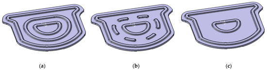 The flame contact of improved design #1, which is a continuous rib design, is shown in Figure 12a. This design still suffers from uneven thickness and localized stress. Therefore, improved designs #2 and #3 are introduced (Figure 12b,c, respectively) to alleviate the local stresses generated by uneven thickness. In improved design #2, the continuous rib of the original pan is transformed to a discontinuous one. In improved design #3, the continuous ribs are removed.