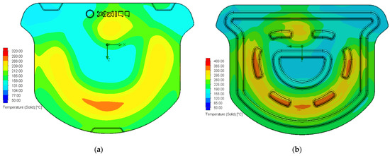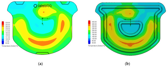 The temperature distribution on the surface of the grill plate of this modified design, shown in Figure 13a, indicates that the high-temperature area is concentrated in the lower middle area, above the combustion tube. The high-temperature areas at the bottom of the stone grill plate are located at the rib positions, as shown in Figure 13b. These locations are above the burner tube, corresponding to the discontinuous rib at the bottom of the stone grill plate. The discontinuous rib at the bottom of the stone grill plate has a maximum temperature of 365 °C (orange area). The minimum temperatures are approximately 120–155 °C. Therefore, the temperature is reduced by 210 °C, as shown in Figure 13b.