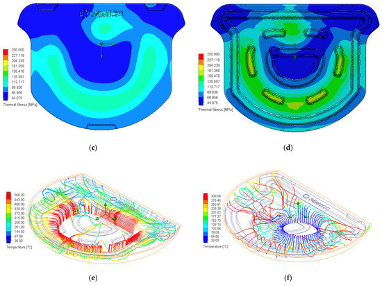 CA#2 stone grill plate. Temperature distribution on the (a) surface and (b) bottom of the plate. Thermal stress distribution on the (c) upper surface and (d) bottom of the stone grill plate. (e) Burner streamline distribution (temperature); (f) Air inlet streamline distribution (temperature).