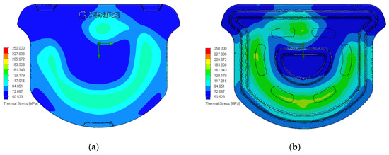 Figure 15 shows that the areas with high thermal stress on the surface of the stone grill appear at the relative positions of the combustion tubes. The maximum thermal stress is approximately 117–139 MPa. In addition, the high thermal stress at the bottom of the stone grill plate appears in locations of the discontinuous ribs. The maximum thermal stress region is approximately 161–183 MPa. The thermal stress is effectively reduced by 41–67 MPa. As shown in Figure 14 and Figure 15, the thermal stress regions are positively correlated with the high-temperature regions. The surface thermal stress distribution in this case is more uniform than that in CA#2.