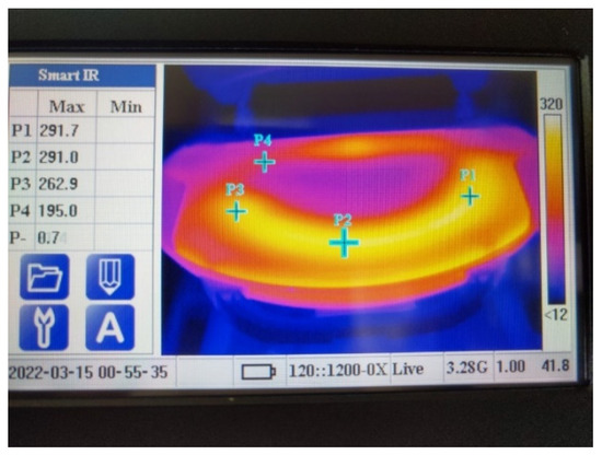 Thermal imaging detection was performed to verify the temperature distribution of the grill plate, as shown in Figure 16. The results show that the temperature distribution of the grill plate is more uniform in the CA#3 configuration. A comparison of Figure 7b (thermal image of the original stone grill) and Figure 16 (thermal image of the CA#3 stone grill) shows that the surface temperature difference of the stone grill is considerably decreased. The specific values are presented in Table 3. By decreasing the temperature difference, the thermal stress on the surface can be reduced, thereby prolonging the service life of the stone grill plate.