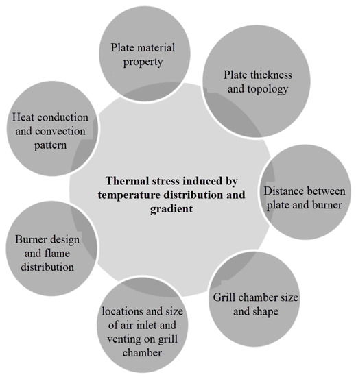 A coupled analysis model was established by combining combustion thermodynamics with heat transfer and the finite element method. The causes of barbecue oven fracturing using a stone grill plate were studied. Simulated mixed air distributions were used to determine the temperature and thermal stress distribution of the stone grill plate after combustion, which were then used as the basis for design optimization. Thermal images were recorded to quantify and verify the accuracy of the simulation. The results demonstrated that narrowing the temperature range can reduce the thermal stress on the surface.