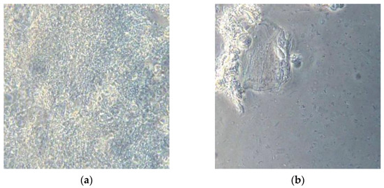 Subgingival plaque images observed under a phase contrast microscope at T1: (a) Non-pathogenic bacterial flora (patient belonging to Group A); (b) Pathogenic bacterial flora (patient belonging to Group B).