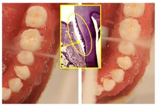 Maintaining a periodontal state of health over time is crucial in evaluating the success of dental treatments. Periodontal maintenance therapy (PMT) and home oral hygiene protocols are the keys to this success. We know from the literature and clinical experiences that, without meticulously organized and performed PMT, patients with a predisposition to periodontal disease are at high risk of reinfection and the progression of periodontal lesions [1]. A large number of failures after nonsurgical or surgical periodontal instrumentation are due to an incomplete cleaning of the root surfaces as well as the near-soft tissues. This is because of the existence of aggressive bacterial aggregations [2] belonging to red and orange Socransky complexes, such as Porphyromonas gingivalis, Treponema denticola, Bacteroides forsythus, Fusobacterium nucleatum and Peptostreptococcus micros. Several works in the literature showed that, with these bacteria, at a one-year follow up, even with frequent dentist appointments, the repopulation of the periodontal pockets is total. This is case whether the treatment is conducted with either with nonsurgical therapies or with regenerative surgeries [3]. Since the 1980s there has been a great deal of research on the use of lasers in periodontology. Various articles available in the literature show that decontamination by laser radiation is possible [4,5,6,7]. Lasers can be applied alone or in association with a photosensitizer. Photo-dynamic therapy (PDT) is the association of light with a chromophore and oxygenated tissues [8]. The aim of this technique is to bring singlet oxygen to all tissues affected by pathogenic bacteria. If the wavelengths used are absorbed in the chromophore used, a laser ray cannot break through very deep, and if the power density is too modest [usually PDT protocols use photobiomodulation (PBM) energy, in order to avoid any thermal damage], the decontaminating effects are not sufficient. Recent research proposed that a combination between high power settings and high frequencies of diode laser 980 nm (using really high peak power combined with a low average power, in order to reduce thermal effects) and hydrogen peroxide 10 volume 3%, or modified hydrogen peroxide 10 volumes 3% could be effective as a means of treatment [9]. This treatment protocol was named “photodynamic therapy without dye” [Oxygen high-level laser therapy (OHLLT)] in the protocol proposed by Gerard Rey in 1999 [10]. Several in vitro and in vivo studies have shown bactericidal activity of laser irradiation combined with hydrogen peroxide on numerous bacterial species [11,12,13,14,15,16]. Another important feature is the photobiomodulation properties of laser at the bone level: these promote the healing process in the post-surgical period and reduce the post-surgical pain [17,18], as well as orthodontic pain [19,20,21]. There are also other in vitro studies that have tested different materials for maintaining oral hygiene, such as MicroRepair (MicroR, a biomimetic hydroxyapatite) and pomegranate (PomeGr, a natural compound) [22], and Copper–Calcium–Hydroxide Solution [23].