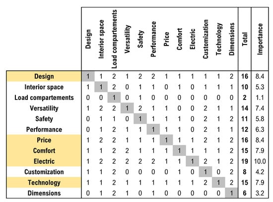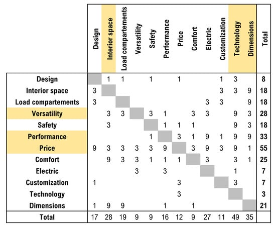 The total dependence grade is given by the sum of the row values, while the total influence grade is given by the sum of the column values. As can be appreciated in Figure 1, the most important requirements are: Design, Price, Visibility, Comfort, Emissions, and Technology.
