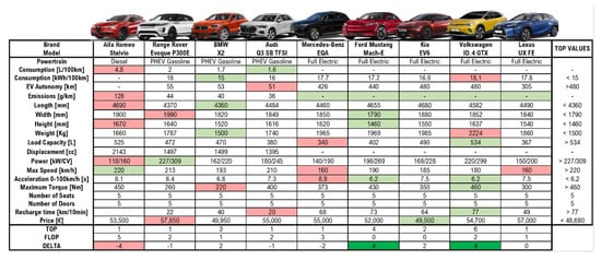 A direct comparison with the company’s main competitors, in relation to the various products already marketed by them, is ideal for two main reasons. Firstly, it allows one to understand what strategies they have devised to meet customers’ needs by offering highly innovative solutions []. Furthermore, it is necessary to understand in which technical-quality aspects it is necessary to invest more time and money to obtain a product which is better than the others and therefore, highly competitive on the market. This type of comparison is called “benchmarking analysis”. In this sample work, nine vehicles are considered as competitors: