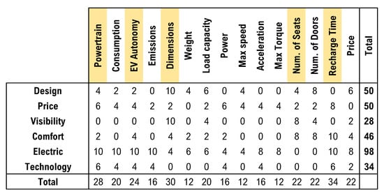 The What–How matrix allows one to compare the requirements of the customers (What) with the designer’s answers (How). Therefore, Figure 4 shows in the rows the requirements of the customers (obtained in the Importance matrix) and in the columns, the parameters used in the Benchmarking Analysis. To set the type of relationship between the customer requirements and the performance of the car, a numerical evaluation was used: non present (0), weak (2), medium (4–6), and strong (8–10). Finally, all the values in each column were summed up and chosen as the many highest values as Delta of Innovation (5) imposed: Type of powertrain system, EV autonomy, General dimensions, Number of seats, Recharge time.
