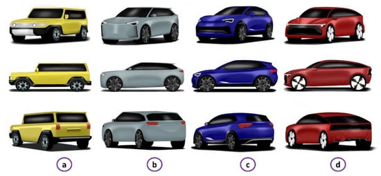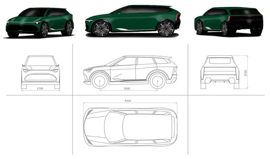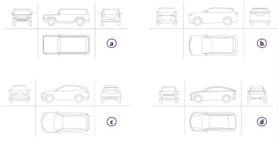 The 2D drawings convert the approximate shapes of the sketches into an orthogonal design (on software such as AutoCAD) making the lines more realistic, so it will be possible to have a clearer overview of dimensions and proportions. Orthogonal projections (Figure 7) were set up as blueprint views starting from the digital sketches, with four projections planes, according to the lateral view, the top view, the back view, and the front view. For each style, the lateral view was drawn into a 4360 mm (length) × 1550 mm (height) square, the top view into a 4360 mm (length) × 1790 mm (width) square, the front, and the back view into a 1790 mm (width) × 1550 mm (height) and the wheelbase was equal to 2680 mm.
