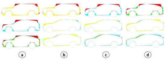 The most successful result came from the Retro style, followed by the Stone one and the Natural one. The last one, in this case, is the Advanced style. Through the aerodynamic analysis, it is possible to evaluate the Cd (drag coefficient) performed on Ansys. This value shows the ability of the car to break through the air, as it is a dimensionless coefficient useful to measure the aerodynamic resistance of a moving body in a fluid: the higher the coefficient is, the greater is the resistance offered by the air and the worse is the aerodynamics of the car []. The drag coefficients were calculated imposing a standard speed of 100 km/h on simplified shapes for each car style. The results obtained were: 1.161 for Retro; 0.838 for Stone; 0.776 for Natural; 0.813 for the Advanced Style. As can be seen from the Cds values, the shape of the Natural and Advance presented a less resistance to the forward motion. However, it is essential to highlight how the results are all remarkably close and oscillate around a Cd equal to 0.8, apart from the Retro.