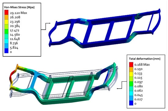 Both configurations were made with the consideration of providing sufficient space for the electric motor mounts, suspension, battery pack, and cable management. This was done assuming a forward-shifted battery position, which would require longer cables to connect all devices. Subsequently, both chassis were validated using structural steel as material in order to guarantee high resistance values while implementing a static structural analysis on Ansys. A vertical load of 13 kN representing the weight of the car’s parts supported by the chassis was applied on the center of mass (CoM), then five remote points were set: (a) Center of Mass (CoM) (for the vehicle load force application); (b) Rear left wheel (pin constraint); (c) Rear right wheel (roller constraint); (d) Front right wheel (roller constraint); (e) Front left wheel (pin constraint). A safety factor of 18.94 was evaluated. Otherwise, considering the chassis without a structural battery, 6 remote points were set because the battery weight was considered as a vertical force to be added to the 13 kN, and they were: (a) Center of Mass (CoM) (vehicle load force application); (b) CoM of the battery (battery load force application); (c) Rear left wheel (pin constraint); (d) Rear right wheel (roller constraint); (e) Front right wheel (roller constraint); (f) Front left wheel (pin constraint). Figure 10 shows the result of the simulation in terms of stresses and total deformation (mm). A safety factor equals to 8.85 was evaluated.