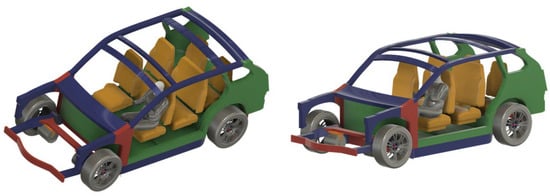 Finally, the upper part was modelled according to the dimensions of the final blueprint. In Figure 11, the final mock-up is shown. With the aim of contextualizing the chassis together with the other elements inside the car, there was created a more complex assembly by also adding wheels, four electric motors, seats in the 7-seat configuration and a hypothetical driver with an average height of 185 cm. This part of the project is particularly useful for an initial assessment of the ergonomics of the vehicle. Possible issues related to incorrect dimensioning of the interior volume or lack of visibility to the outside should already emerge at this design stage. The simplified model of a driver helps even more in making these assessments.
