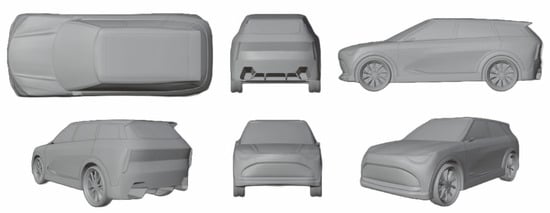 3D body-surface modelling is used to create a 3D drawing where the designers can interact in a more dynamic way. In this phase, it is possible to introduce accurate details with more refined and precise shapes, which cannot be obtained with sketches and blueprints []. Starting from the blueprints of the car, the external body of the vehicle was modelled on Blender using subdivisions surfaces using the blueprints as a guide. The modelling of the car body is critical and requires months of work in a specialized company. The quality of the model must be faultless or defects in it will be reflected in dents and blemishes that will appear on the physical model of the vehicle. The use of subdivision surfaces is excellent to ensure a continuity of curvature even in the most geometrically complex areas; they are also very quick to implement. However, neither this type of surface nor the use of software such as Blender is adequate for a product that is to be engineered. Blender is not a CAD, like NX or Catia, software used in high-class companies like Mercedes and BMW. However, the methodology described here is excellent if applied with the aim of obtaining an initial styling result of the finished SUV in a short time. The final 3D model is shown in Figure 12.