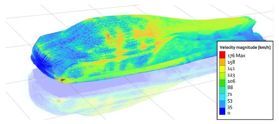 Once the external shape of the final model of the car was obtained, the entire series of aerodynamic tests designed for the model had to be re-performed. As can be seen in Figure 13 and Figure 14, a considerable improvement was obtained, demonstrating that the stylistic choices were also appropriate from an engineering point of view. To perform the fluid dynamic analysis, the first thing to do is to derive a negative of the vehicle that is as simplified as possible. This means that small shape details (door handles, vehicle logo, style lines on the body, and so on) should be removed so as not to unduly lengthen the time of mesh computation and analysis resolution by the software (Ansys Fluent in this case). Moreover, such details do not have a major influence on the final value of the vehicle drag coefficient and the distribution of air velocity flow around it. It was chosen to work with a k-epsilon model (settable on Fluent) and a vehicle speed of 130 km/h. The outlet pressure of the air flow was set equal to atmospheric pressure for obvious reasons.