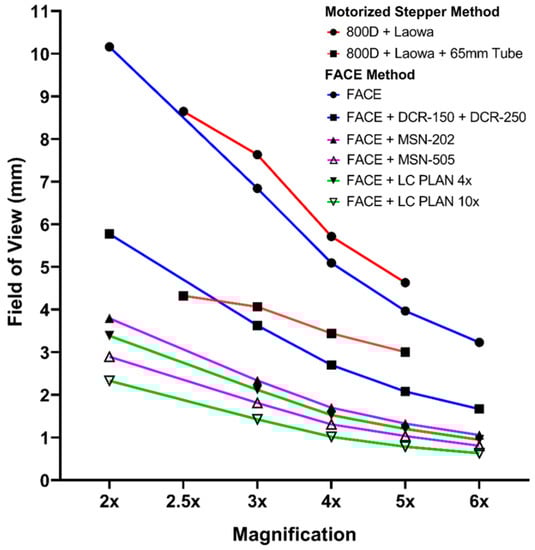 Comparison of the field of view (FOV) between the current FACE and motorized stepper setups with various lens combinations. The X-axis indicates magnification levels for the different photography systems. The Y-axis indicates the corresponding field of view (Abbreviation: 800D, Canon EOS 800D camera; Laowa, Laowa 25 mm macro lens. Tube, 65 mm extension tubes).