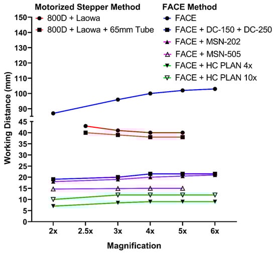 Next, the working distance between the lens and subjects for both methods was also measured to investigate how much space was left between the front lens and the subject. For the current FACE system, the working distance from 2× to 6× magnification was maintained at 87 to 103 mm. However, after being mounted with a macro lens, the working distance sharply declined to either 40 mm (DCR-150 and DCR-250), 20 mm (DCR-150 + DCR-250 and MSN-202), or 15 mm (MSN-505). Furthermore, when microscopic objective lenses such as 4× or 10× magnification power were installed, the working distance sharply declined to 10 mm. On the contrary, the current motorized stepper system coupled with Laowa 25 mm macro lens maintained a consistent working distance of around 40 mm at all magnification levels (Figure 3). Therefore, although the current FACE system could reach very high magnification with smaller FOV, the relatively short working distance caused the operation to be less convenient compared to the current motorized stepper system. As a result, the operation of the FACE method at a high magnification power should be performed with caution to avoid a collision between samples and the lens.
