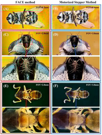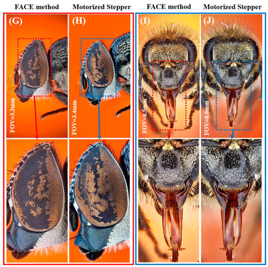 The comparisons of several stacked images of various insects shot at different orientations by FACE (red color) and motorized stepper (blue color) methods. (A,B) Ventral view images of fly stacked from 163 and 166 images captured by the FACE system and motorized stepper, respectively, with 2.5× magnification. (C,D) Ventral view images of the fly head stacked from 180 photos captured by the FACE system with a 4× objective lens at a 2.5× magnification and 81 photos captured by the motorized stepper system at a 5× magnification with 65 mm extension tubes, respectively. (E,F) Dorsal view images of an ant stacked from 91 images captured by the FACE system with a 4× objective lens at a 2.5× magnification and 51 images captured by the motorized stepper system at a 5× magnification with 65 mm extension tubes, respectively. (G,H) Lateral view images of the hoverfly stacked from 155 photos captured by the FACE system with a 4× objective lens at a 2× magnification and 81 photos captured by the motorized stepper system at a 4× magnification with 65 mm extension tubes, respectively. (I,J) Frontal view images of a honeybee stacked from 249 images captured by the FACE system at a 2.5× magnification and 166 images captured by the motorized stepper at a 2.5× magnification, respectively. Zoom-in inset images of the same image regions in every comparison are provided below each image.