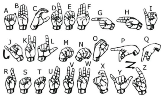 Sign language is widely used by hearing-impaired people to communicate with each other. In daily life, we can see sign language interpreters in the live news or weather forecast, but most people with normal hearing could hardly understand the meaning of their expressions. Meanwhile, it is also difficult to start a conversation with real-life sign language users. With sign language recognition (SLR), the communication barriers could be alleviated. In American sign language (ASL), twenty-six special hand gestures representing the letters in the alphabet (A–Z) are normally used to spell proper nouns like names, technical terms, and abbreviations or unfamiliar words [], which accounts for 12% to 35% of ASL []. Figure 1 shows the alphabet of ASL constituting designated fingers and hand-shape gestures [].