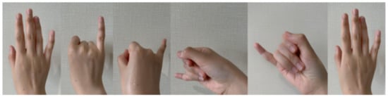 In the previous works of sign language recognition, the signs in the alphabet are regarded as static (24 signs without “j” and “z”) or dynamic (all 26 signs) processes. In this study, all the signs are regarded as dynamic processes, because the next task conducted is the fingerspelling recognition, containing a sequence of dynamic gestures in the data. As shown in Figure 2, we set a rest state as the start and end of each sign. The sign starts from a rest state and finally returns to the original rest state.