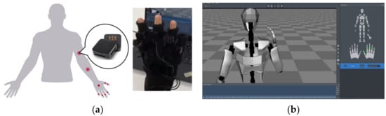 Perception Neuron motion capture system for right hand []: (a) distribution of sensors; (b) main interface of Axis Neuron software.