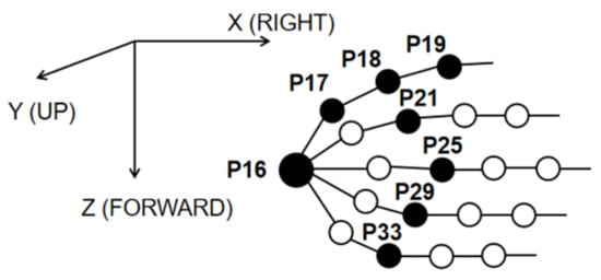- Group 1: Angle differences in the direction of hand extension/flexion with P17 (Wrist joint) as the reference. {P2(Proximal end of thumb)–P17, P3(Distal end of thumb)–P17, P5(Proximal end of index finger)–P17, P6(Middle of index finger)–P17, P7(Proximal end of middle finger)–P17, P8(Middle of middle finger)–P17, P10(Proximal end of ring finger)–P17, P11(Middle of ring finger)–P17, P13(Proximal end of pinky finger)–P17, P14(Middle of pinky finger)–P17}