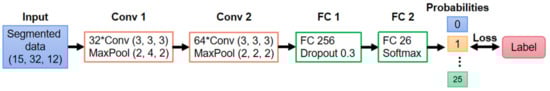 When using the raw data as input, the model mainly contains two layers: CNN and the Fully Connected (FC) network (shown in Figure 5). CNN is used as a feature extractor, and the fully connected network is used as a classifier []. A softmax function finally calculates the probabilities of all classes and chooses the class with the largest probability as the model output (top 1 accuracy).