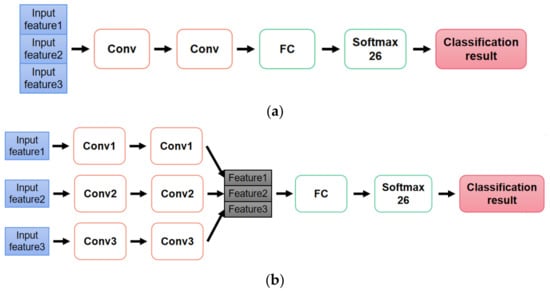 Classification models with multi-features as input. (a) Early fusion model. (b) Late fusion model.