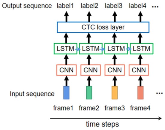 The input of a word formed by letters is a long signal containing a sequence of hand gestures. Using the sliding window method, the long input is segmented into frames along the direction of time. As shown in Figure 7, the model of sequence recognition mainly contains three layers. The first layer is CNN which extracts features from each frame of input data. The second layer is long short-term memory (LSTM). LSTM is widely used in modeling temporal dependence. As an extended model of Recurrent Neural Network (RNN), LSTM can preserve long-term dependence by controlling the percentage of previous information dropping, current information inputting, and current information outputting []. The final layer is CTC, which eliminates the need to know the alignment between input and output [].