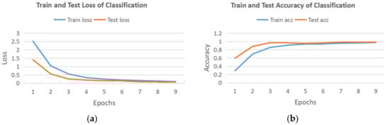 In the classification of twenty-six hand gestures, we first evaluate the model using the raw data as input. Eighty percent of data is randomly selected from the dataset as the training set, and the remaining twenty percent of data is the testing set. The training and testing process (Python: Python Software Foundation, Beaverton, OR, USA; PyTorch: Meta AI, New York City, NY, USA) is shown in Figure 9. The model converged quickly, and finally, the accuracy of the testing set reached nearly 100%.