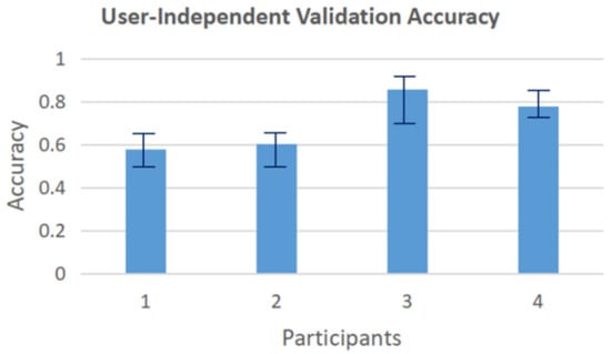 In user-independent validation, the data of each of all four users are regarded as the testing set, respectively, and the data of the remaining three users are used to train the model. The model’s prediction results on testing sets are shown in Figure 10. The average accuracy of four users drops to 70.3%, compared with nearly 100% without considering cross-user validation. Participants 3 and 4 show higher accuracy than participants 1 and 2. The influencing factors for the drop in accuracy include the differences in body size, range of motion, and different understanding of gestures among participants which leads to different hand movements.