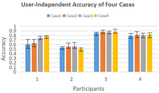 The results of these four cases in user-independent validation are shown in Figure 11. The average accuracy of each participant is (69.0%, 54.0%, 86.8%, 80.6%), which is (11.4%, −6.1%, 1.3%, 2.7%) higher than the raw data classification results of (57.6%, 60.1%, 85.5%, 77.9%). The accuracy for the first user increases dramatically but for the second drop a little. The average accuracy of the whole dataset increases by 2.3%, so the selected features show a better performance than the raw data. Among all the four cases, Case 4 shows the highest accuracy at 74.8%, which is 4.5% higher than using the raw data, and 2.2% higher than the average accuracy of all these four cases. In summary, by using the four groups of differences in R_Z between non-adjacent joints as input to a late fusion classification model, the user-independent accuracy finally reaches 74.8%. The precision, recall, and F-1 score of the best-performed Case 4 are listed in Table 4.