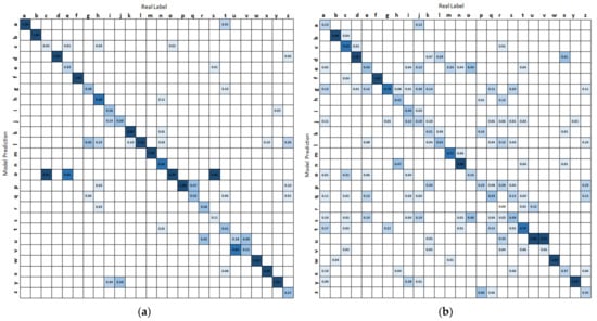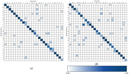 The accumulated confusion matrices of four participants under four cases are shown in Figure 12. Participant 3 gives the best performance, and participant 2 gives the worst results. In reality, participant 2 has a relatively specific body shape among all users. Besides, some easily confused gestures are “i” and “j”, “u” and “v”, “g” and “j”. These gestures have similar hand shapes or movements.