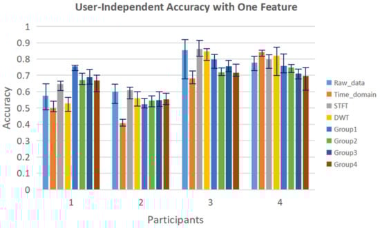 When using only one feature as input, the user-independent validation results are illustrated in Figure 13. The STFT feature gives the best result among all the features. Besides STFT, Group 1 of differences in R_Z between non-adjacent joints also shows higher accuracy than using the raw data as input. Other features show relatively lower accuracy than the raw data. The result illustrates that it is encouraging to combine multiple features as input.