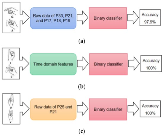 Binary classification of easily confused gesture groups: (a) “g” and “j”; (b) “i” and “j”; (c) “u” and “v”.