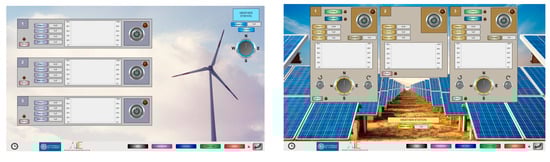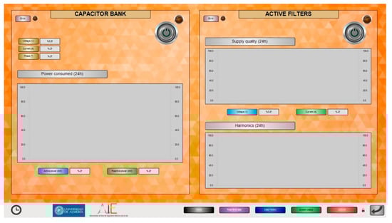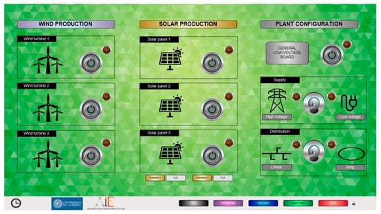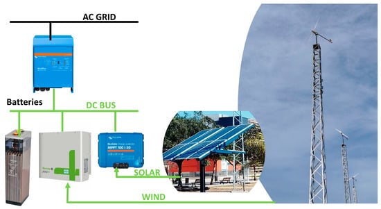 - Renewable Energy Area. This area is where the electricity produced by the PV and wind plants is injected/see Figure 2). The first one is composed of 18 poly-crystalline 270 W solar panels, and the wind power plant hosts three 1500 W wind turbines. In this zone, solar and wind charge controllers adapt the voltage of the electricity produced by the renewable generators to a 12 V direct current voltage. Once transformed, this electricity can be directed to the batteries of the laboratory or to the local electrical consumption. In the latter case, the power inverters will transform it again up to 230 V alternating current. The inverters are three single-phase devices that can be combined to supply three-phase currents when required. In this area, there is also a capacitor bank and active filters, both aimed at improving the quality of the power supply.