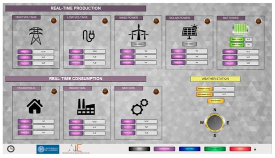 - Control Room Area. Finally, the sixth zone is where the main screen of the SCADA system designed in this study is located, as well as the Beckhoff PLC, which manages the input and output information from consumption and production to the SCADA and vice versa. In order to handle all the information that is to be shown on the main screen of the SCADA, decentralized periphery is used. In this case, there are four main spots that group relevant data of each zone of the laboratory under study. Thus, zones 2, 3, 4, and 5 have an EtherCAT Coupler with input and output cards that manage the flow of information from the peripherals to which they are connected. The aim of equipping these zones with their own EtherCAT Coupler is to sort out data by area and minimize the amount of wire used for connections.