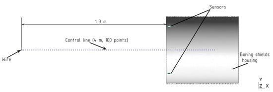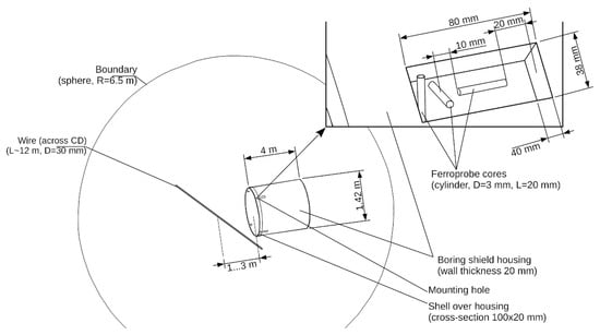 5], but the design of its body, together with the sensors, was not altered. The conductor model is made in the form of a cylinder with a diameter of 30 mm, crossing the entire computational domain, i.e., the beginning and end of the conductor model are determined by the computational domain boundaries. The conductor axis is parallel to the Z-axis of the computational domain coordinate system. The shield body is made in the form of a 4 m long pipe with a wall thickness of 20 mm. The pipe’s outer diameter is 1.42 m. The longitudinal axis of the microtunneling shield model is parallel to the X-axis of the computational domain coordinate system. The body shell (cross-section 20 × 100 mm) of the tunneling shield has rectangular 35 × 80 mm holes (