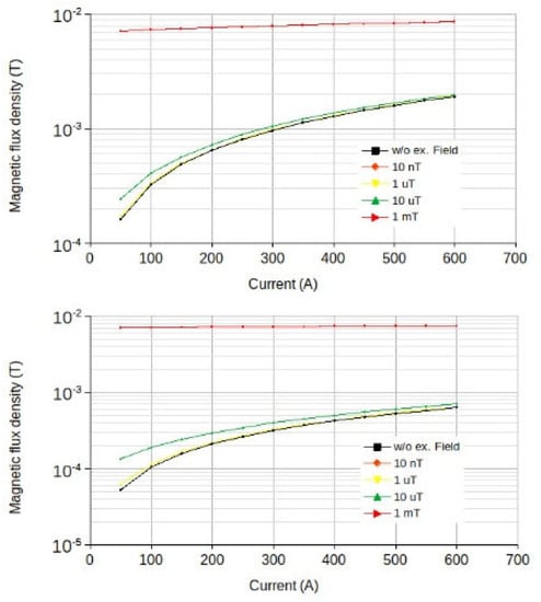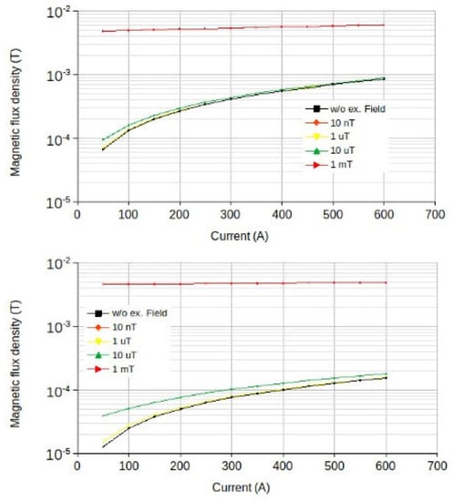 Figure 3. An external magnetic field with an induction of 10 nT does not have a significant effect on the topology of the magnetic field of an energized cable compared to the case without an external magnetic field. An external magnetic field with an induction of 1 µT with a current value of 300 A results in a significant change in the induction along the control line at a distance of over 2.7–2.8 m from the cable axis, and with a current of 50 A, significant changes occur already at a distance of 0.8–0.9 m from the cable axis. One can also note the appearance of a local minimum of the magnetic flux density value in the immediate vicinity of the tunneling shield body end (distance 2.9 m from the cable axis). The minimum value of the magnetic flux density along the control line with an external field induction of 10 µT for a current value of 50 A is achieved at a distance of 0.9 m from the conductor, and for a current of 300 A only at 2.7 m. In this situation, the value of the local minimum is a sequence higher than for the case with a magnetic field induction of 1 µT. An external field with a magnetic flux density of 1 mT results in a significant change in the topology of the energized cable electromagnetic field. Significant changes already occur at distances of 0.1–0.2 m from the axis of the energized cable and at distances of over 0.7–0.8, the value of the magnetic flux density along the control line is almost independent from the current in the cable. Thus, an increase in current from 50 A to 300 A results in a magnetic flux density growth of 4.5% at a distance of 1 m, while at an external field flux density value of 1 µT, the change was 85%.