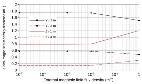Figure 6). The difference between the values of the Y-component of the magnetic field vector in the ferroprobe core and the current strength in the 50 A and 600 A cables without an external field and 1 m distance between the microtunneling shield and the cable axis is 1748.9 µT. When exposed to an external field with an induction value of 1 µT, the difference decreases to 1748.3 µT, and when the magnetic flux density of the external field is 10 µT, it decreases to 1743.4 µT. Furthermore, only an external field with an induction value of 1 mT results in a decrease in the difference of the Y-component to 1514 µT. With an increase in the distance between the microtunneling shield and the cable axis to 3 m, the difference in the values of the Y-component of the magnetic field vector in the ferroprobe core between the current strength in the cable of 50 A and 600 A in the absence of an external field, decreases to 576.6 µT. An external magnetic field with an induction value of up to 10 µT does not cause a significant decrease in the difference between the values of the Y component. With an increase in the magnetic flux density value of the external field to 1 mT, the difference in the values of the Y-component decreases to 476.6 µT. The nature of the change in the difference between the values of the Z-component is similar but has a trend towards an increase in the value with an increase in the value of the external field induction.