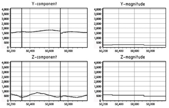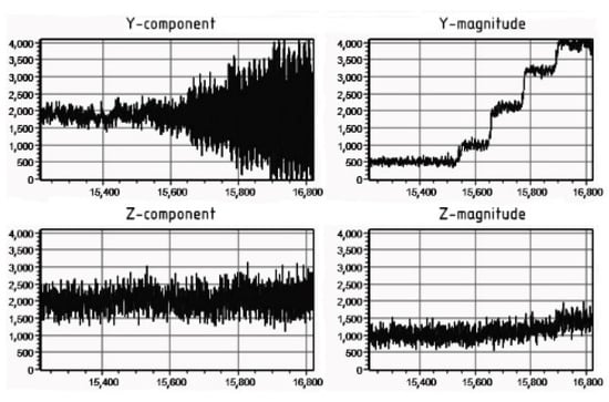 4]. Considering the relative position of the energized cable and the microtunneling shield, the most significant changes in the magnetic flux density with a change in the cable current will be observed in the cores of the Y-components of ferroprobes, which was also demonstrated in [