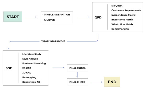 Moreover, this solution combines innovative and logical product conception tools such as Quality Function Deployment (QFD), benchmarking, and top-flop analysis [19], among others. The application of IDeS towards the present work can be structured in the following scheme, which summarizes the process involved (Figure 1).