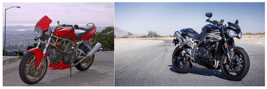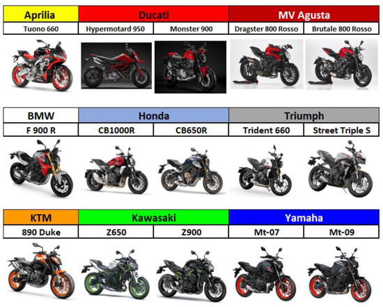 - MotoDeal Naked vs. Sportbikes—What’s the Difference? Available online: https://www.motodeal.com.ph/articles/motorcycle-features/naked-vs-sportbikes-whats-difference (accessed on 24 February 2022).