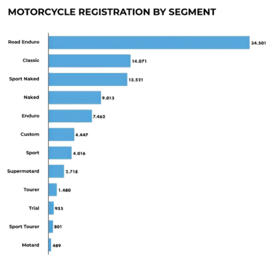Motorcycle registrations by segment in Italy for the year 2021.